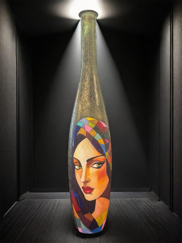 Nadia met toegepaste kunst, van vazen en kastjes tot etalagepoppen. ze werkt met acryl en epoxy en creëert mozaïeken van oude spiegels en tegels.